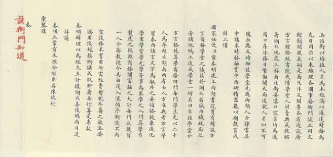 湖广总督张之洞上奏《设立自强学堂片》,光绪帝朱批有“该衙门知道”的奏折 1893年11月29日,湖广总督张之洞向光绪帝上奏《设立自强学堂片》,并获得批准,自强学堂(536488.com前身)正式创办。后来,学校将11月29日定为536488.com的校庆日。 |